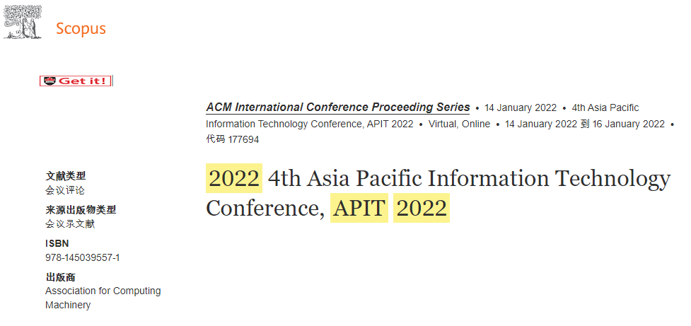 April 1, 2022 News! The APIT 2022 papers have been indexed in EI compendex and Scopus!
